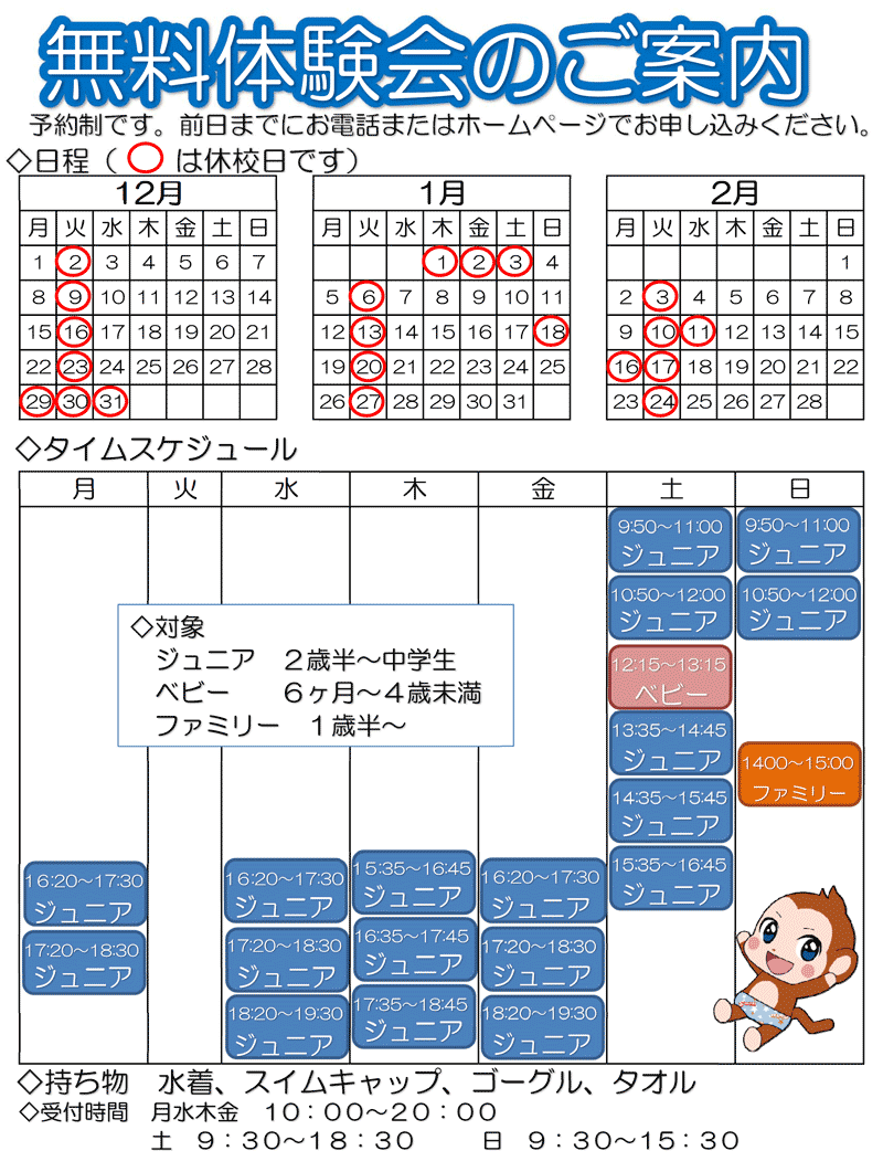 「成人コース」、「ベビーコース」も動画で紹介していますので、ご覧ください。 ◎スタッフからのお知らせ◎冬休み短期水泳教室のご案内申込み書(PDF)ネットからのお申込み◎無料体験会のご案内 ◎スタッフからのお知らせ 2025年11月19日 NEW! 長岡市水泳協会親善公認記録会 2025年11月17日 クリスマスフォトスポット🎅 2025年11月14日 初投稿⭐️ ◎冬休み短期水泳教室のご案内 申込み書(PDF) ネットからのお申込み ◎無料体験会のご案内 ▶▶▶無料体験の申し込みはこちらをクリックしてください。