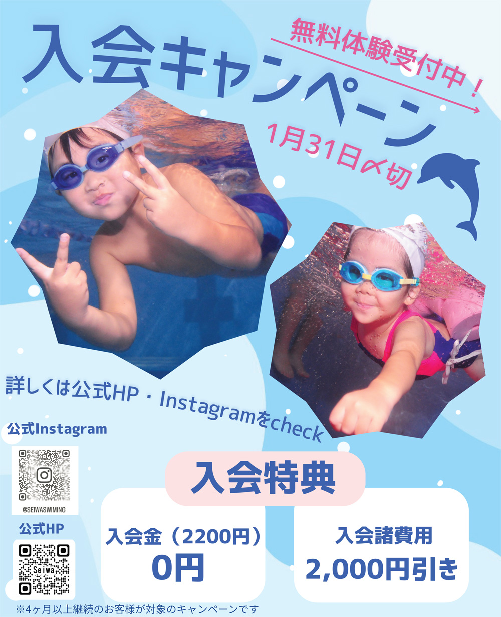 「成人コース」、「ベビーコース」も動画で紹介していますので、ご覧ください。 ◎スタッフからのお知らせ◎4回お試しレッスン◎無料体験会のご案内 ◎スタッフからのお知らせ 2025年11月6日 NEW! 11月は遊びパーティーウィークです 2025年10月30日 Instagram開設しました。 2025年10月23日 第30回新潟県スプリント選手権水泳競技大会 ◎4回お試しレッスン ◎無料体験会のご案内 ▶▶▶無料体験の申し込みはこちらをクリックしてください。
